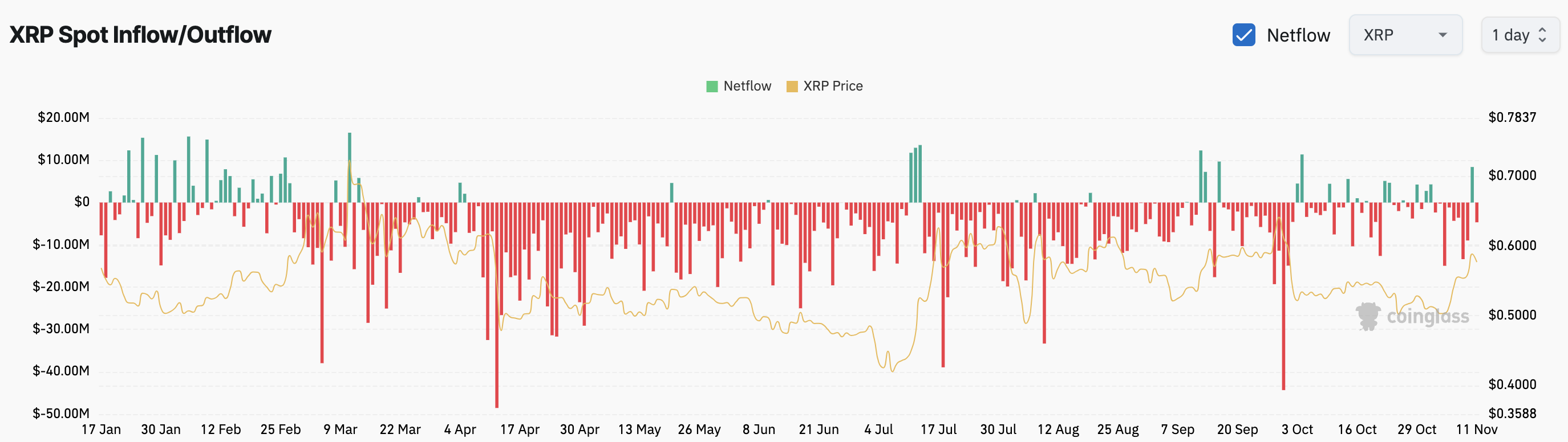När stora mängder tokens strömmar in på börser kan det signalera en avsikt att sälja, vilket ökar nedåtgående prispress. I detta fall har dock cirka 5 miljoner USD värda av XRP lämnat börserna under de senaste 24 timmarna.