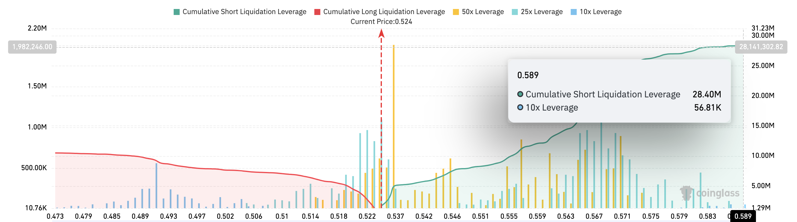 Enligt Coinglass, om Ripples (XRP) pris når 0,60 USD, kommer det att eliminera miljoner USD i öppna kontrakt. Derivatinformationsportalen anger att denna nivå representerar den högsta XRP-likvidationspriset.