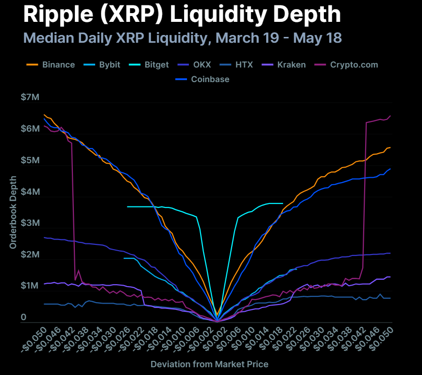 Inom det intervallet visar XRP cirka 15 miljoner USD i tillgängliga order över åtta börser. Två tredjedelar av det finns hos de tre största.