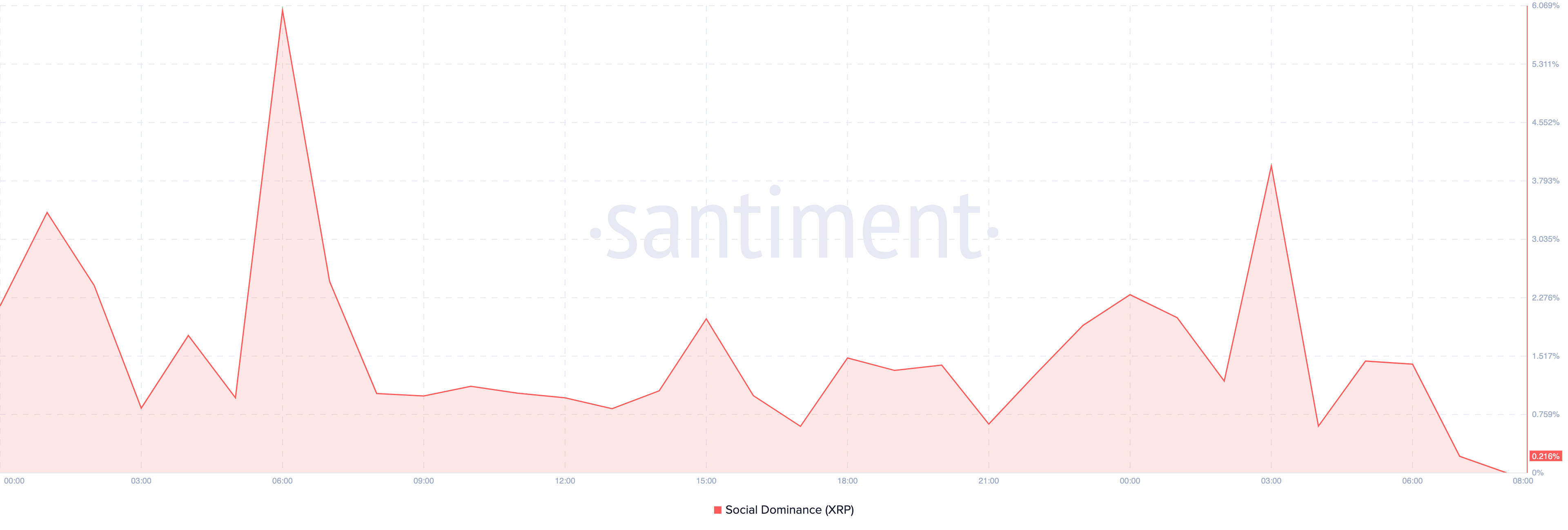 Dessutom visar data från krypto-intelligensplattformen Santiment en minskning i XRP:s sociala dominans. Detta mått mäter frekvensen av diskussioner kring en kryptovaluta i förhållande till andra i topp 100 efter marknadsvärde.