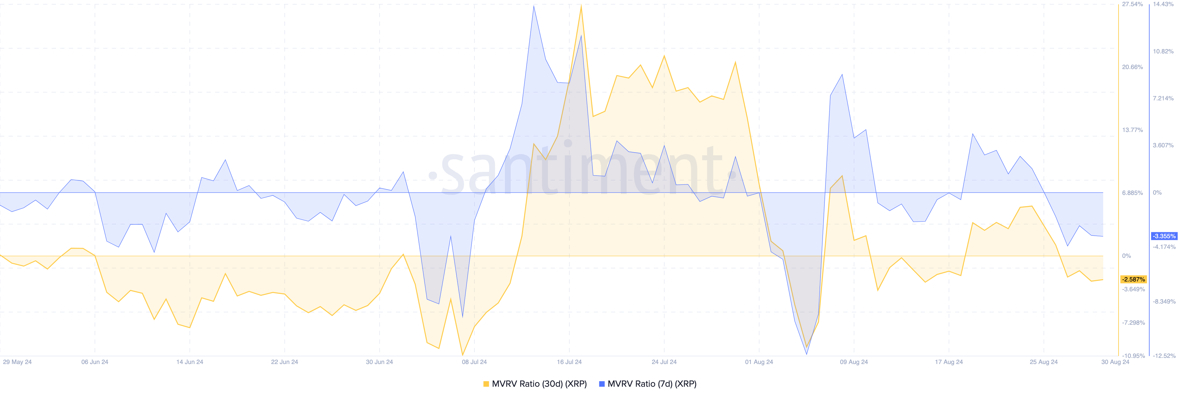 Den 24 augusti var XRP:s 30-dagars MVRV-förhållande 5,57%. Detta antyder att om varje innehavare skulle sälja, skulle kryptovalutan ge ungefär 6% i vinster. Samma datum var det sju dagars MVRV-förhållande 10,65%, vilket indikerar att en högre procentandel av XRP-innehavare satt på oreviderade vinster.
