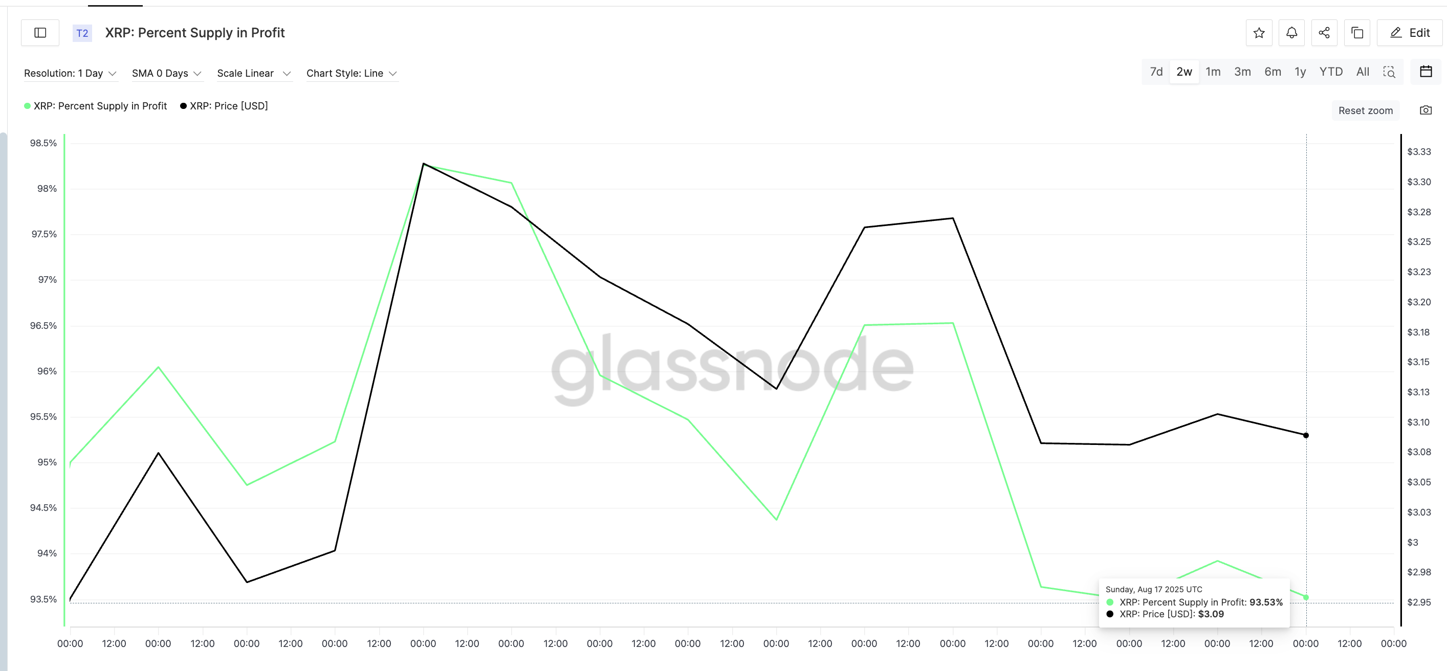 Den 17 augusti var XRP:s procentandel av utbudet i vinst 93,53%, den lägsta på nästan två veckor. För att sätta det i perspektiv, bara tio dagar tidigare, den 7 augusti, nådde samma mätvärde sin topp på 98,26%.