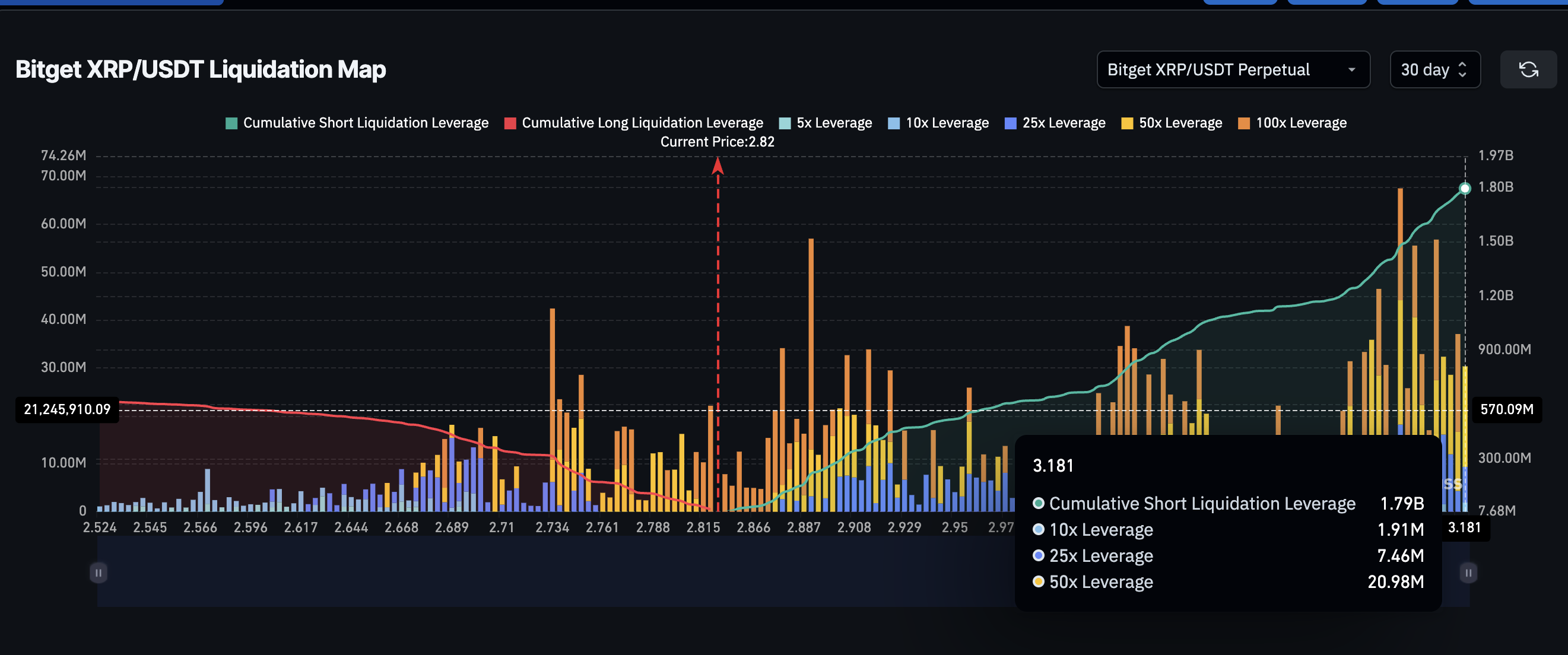 Likvidationskartor visar en klunga av korta positioner ovanför 3,18 USD. På Bitget såg de senaste 30 dagarna 1,79 miljarder USD i korta likvidationer mot bara 617 miljoner USD i långa. Binance visar en liknande skevhet — 430 miljoner USD korta mot 152 miljoner USD långa. På de två största plattformarna har korta varit 3x mer sårbara.