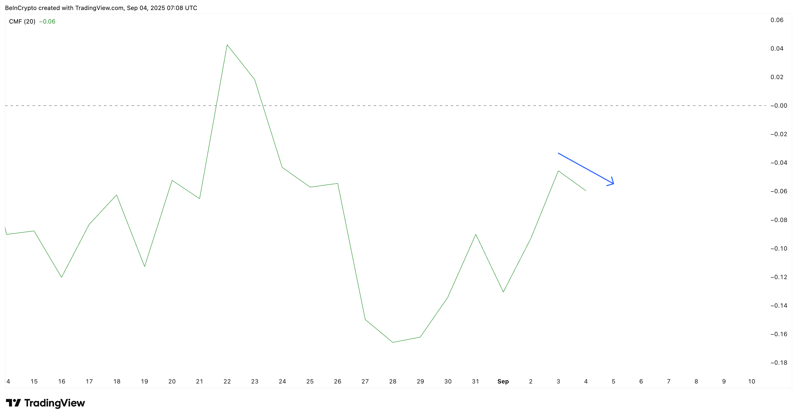Money Flow Index (MFI), som mäter köp- och säljstyrka baserat på volym, har trenderat uppåt. Detta signalerar vanligtvis att köpare kliver in och samlar på sig vid dippar. Men Chaikin Money Flow (CMF), som spårar kapitalinflöden mot utflöden, har sjunkit.