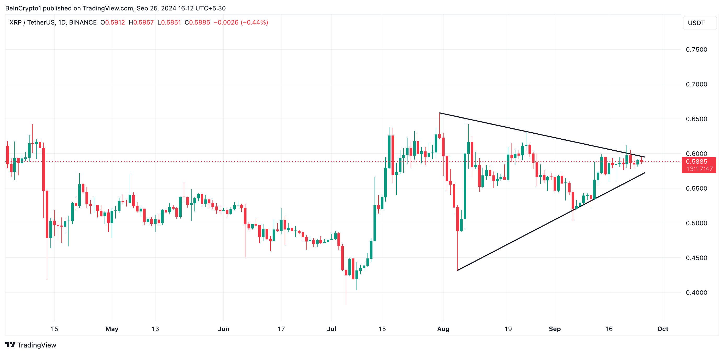 När en tillgång handlas inom en symmetrisk triangel signalerar det en period av konsolidering eller marknadsosäkerhet, där priset fluktuerar mellan två konvergerande trendlinjer som bildar motstånds- och stödnivåer. För närvarande handlas XRP till 0,58 USD, strax under det viktiga motståndet vid 0,60 USD.