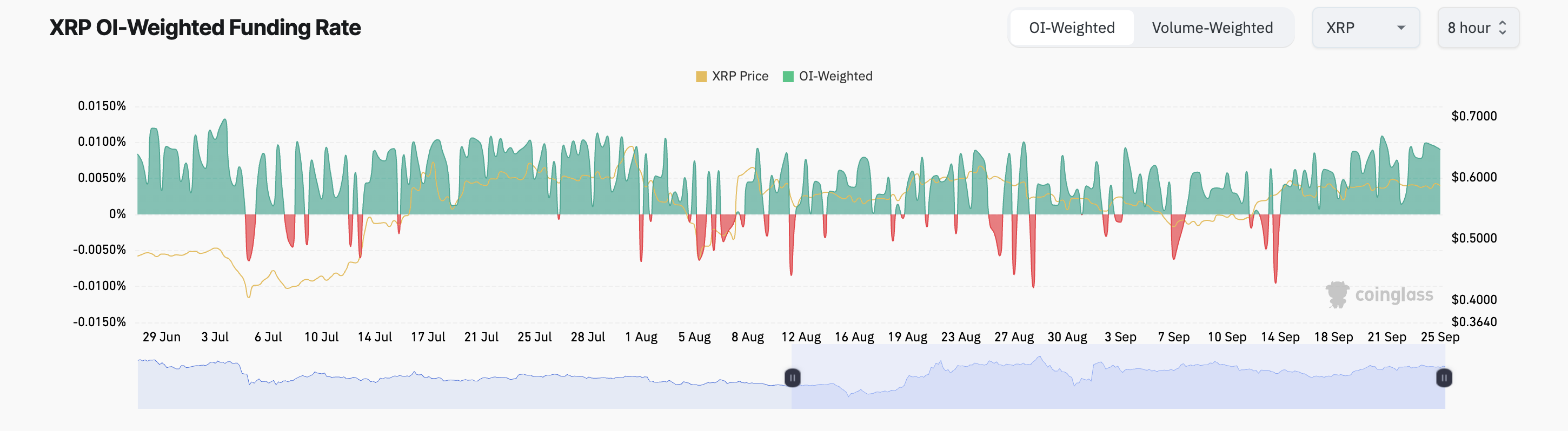 Dessutom är den nuvarande sviten av positiva finansieringsräntor som registrerats av XRP ytterligare en anledning till att dess pris snart kan nå 0,70 USD. Vid publiceringstidpunkten är tokens finansieringsränta 0,0090% och har endast visat positiva värden sedan den 14 september.