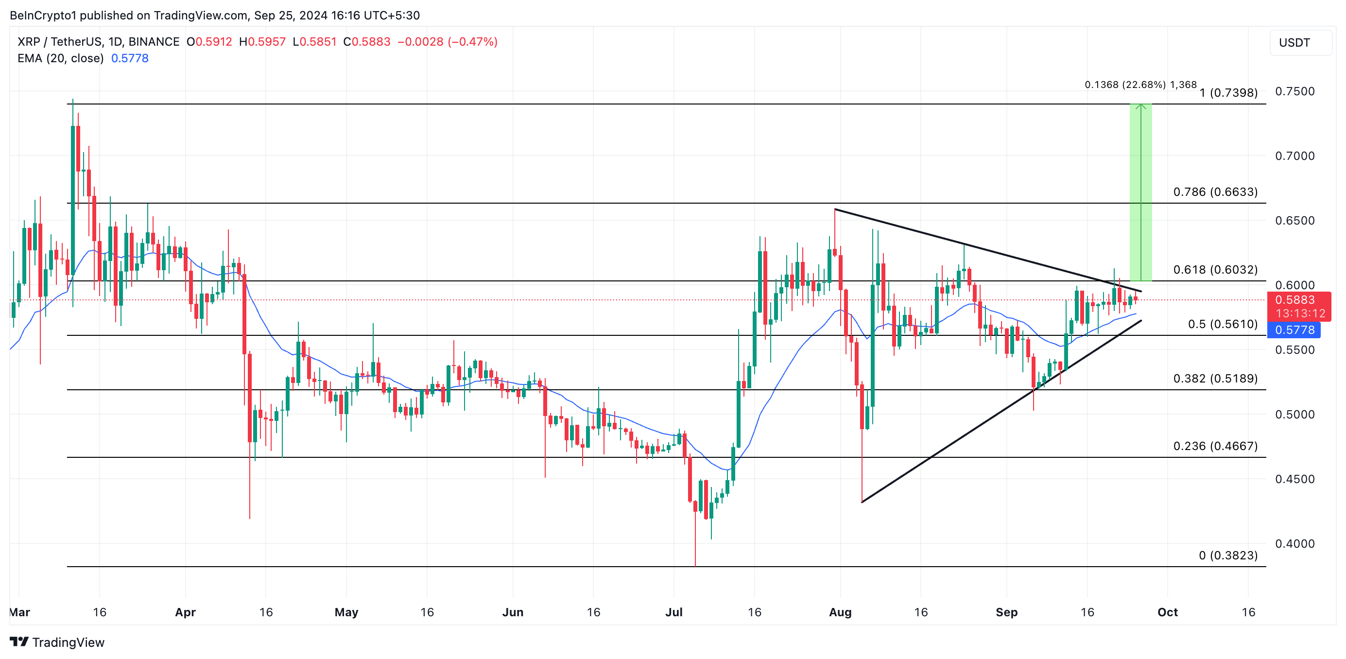 Om XRP bibehåller denna upptrend kan det bryta över den övre trendlinjen i det symmetriska triangelmönstret. Fortsatt ackumulering kan leda till en ytterligare prisökning på 23%, vilket skulle ta XRP till 0,73 USD.