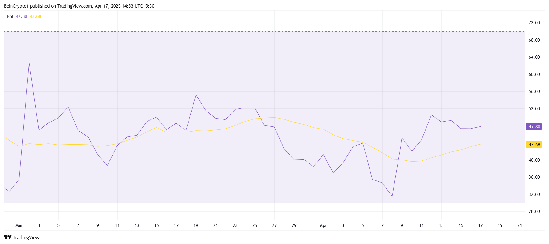 Ur ett tekniskt perspektiv har Relative Strength Index (RSI) för XRP fastnat i den negativa zonen de senaste två månaderna. Även om det ibland har stigit över den neutrala linjen vid 50, har det mestadels legat under, vilket signalerar brist på positivt momentum. Denna ihållande negativa trend har motverkat långsiktiga innehavares ansträngningar att höja priset.