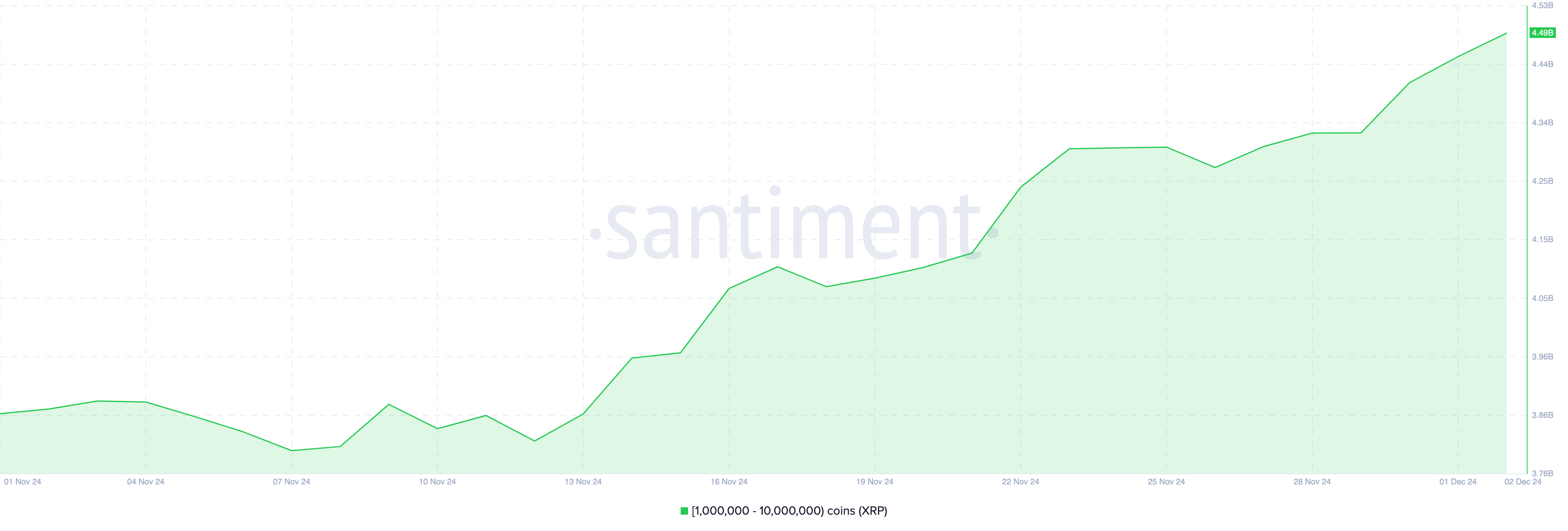 Enligt BeInCryptos fynd och data från Santiment kan denna uppgång kopplas till betydande aktivitet från valar. Under de senaste tre veckorna har plånböcker som innehåller mellan 1 miljon och 10 miljoner tokens samlat totalt 697,1 miljoner XRP.