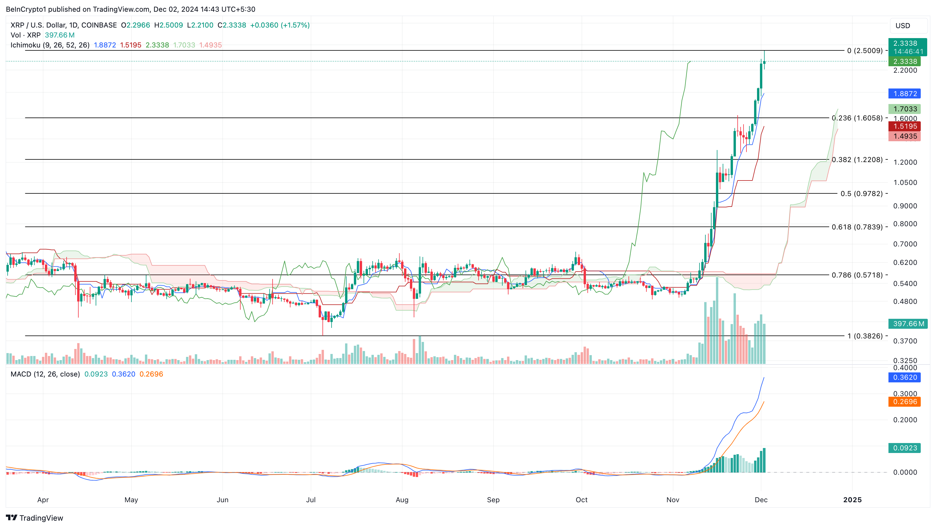 Ripple (XRP) har stigit till en sexårshögsta på 2,49 USD, en ökning med nästan 30 % de senaste 24 timmarna. Denna prisökning är en stor milstolpe för XRP, som har haft svårt att hålla en jämn uppåtgående trend sedan Ripples rättsliga strid med SEC började för fyra år sedan.
