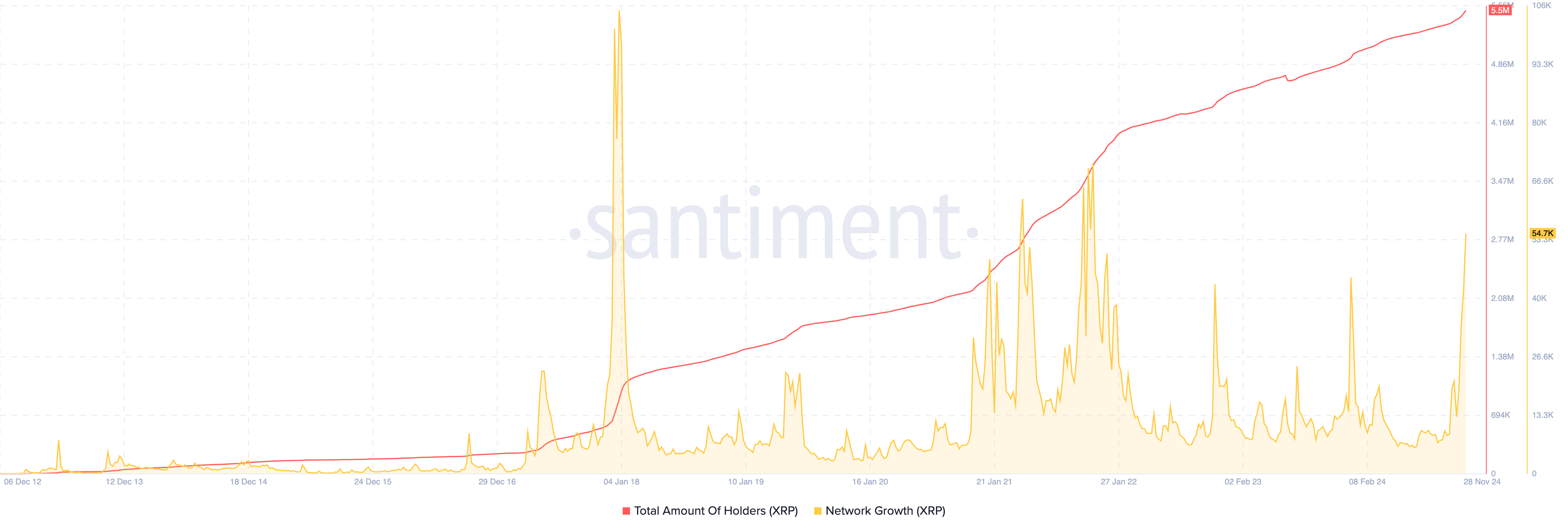 Antalet XRP-plånböcker har nått en rekordhög nivå på 5,5 miljoner, vilket indikerar att många tidigare inaktiva plånböcker nu har saldon. Denna trend stöds ytterligare av nätverkstillväxt, som mäter nya adresser som genomför sina första transaktioner.