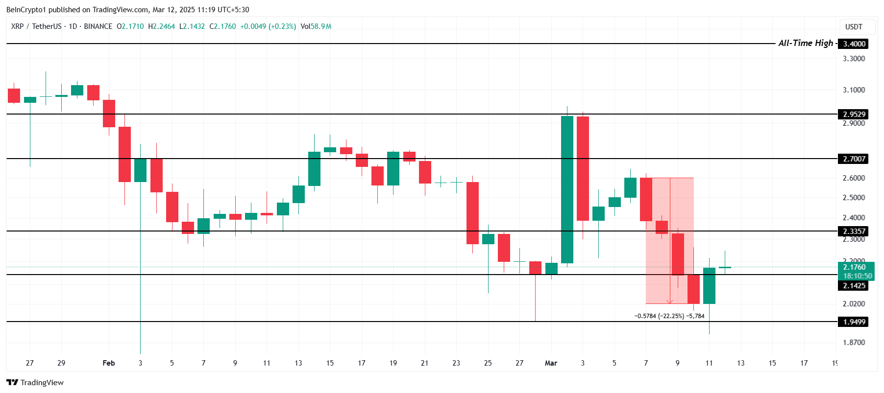 XRP:s pris ligger för närvarande på 2,17 USD, och håller sig över stödnivån på 2,14 USD. Trots en nedgång på 22 % de senaste veckorna har altcoin lyckats hålla sig över den kritiska nivån på 2,00 USD. Även om den nuvarande nivån är lovande kan det bli svårt att bryta igenom 2,33 USD-barriären på grund av bristen på starka positiva signaler på marknaden.