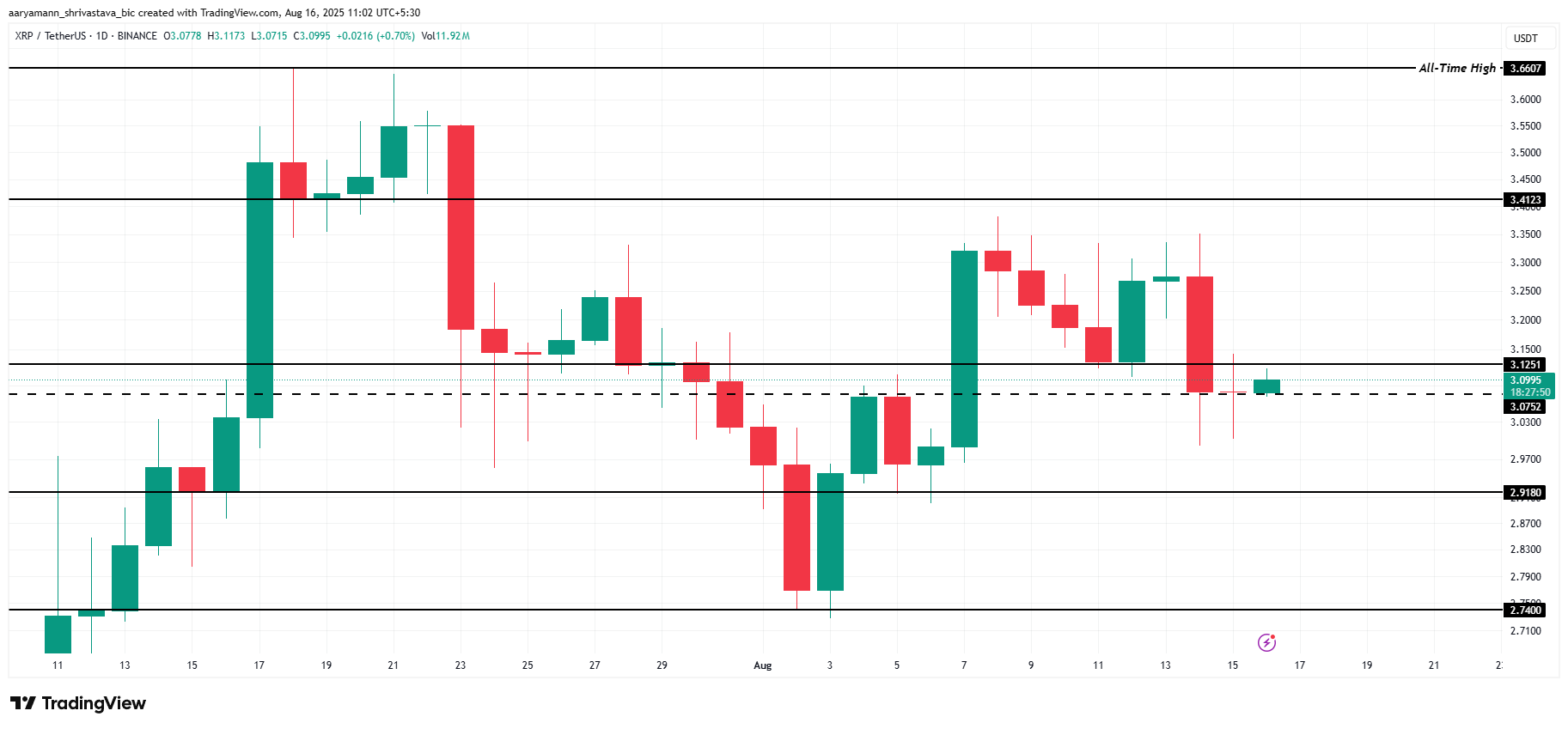 Vid skrivande stund handlas XRP till 3,09 USD, och håller sig över stödnivån på 3,07 USD. Den senaste prisutvecklingen indikerar att XRP sannolikt inte kommer att falla under 3,00 USD, särskilt med starkt stöd på plats. Denna stabilitet är viktig för en potentiell återhämtning.