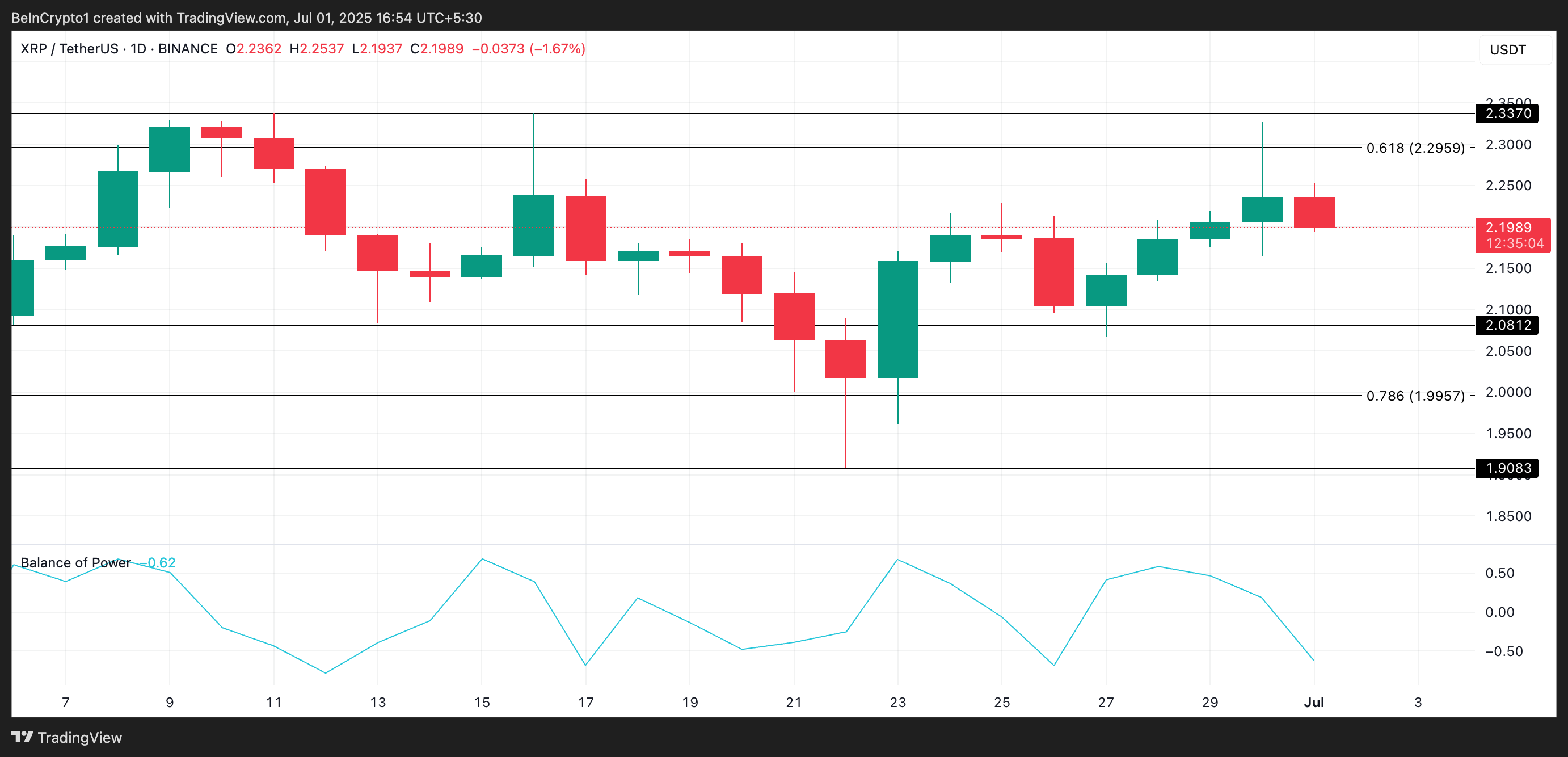 På det dagliga diagrammet stöder XRP:s negativa Balance of Power (BoP) denna negativa utsikt. Vid presstiden är denna momentumindikator på -0,62.
