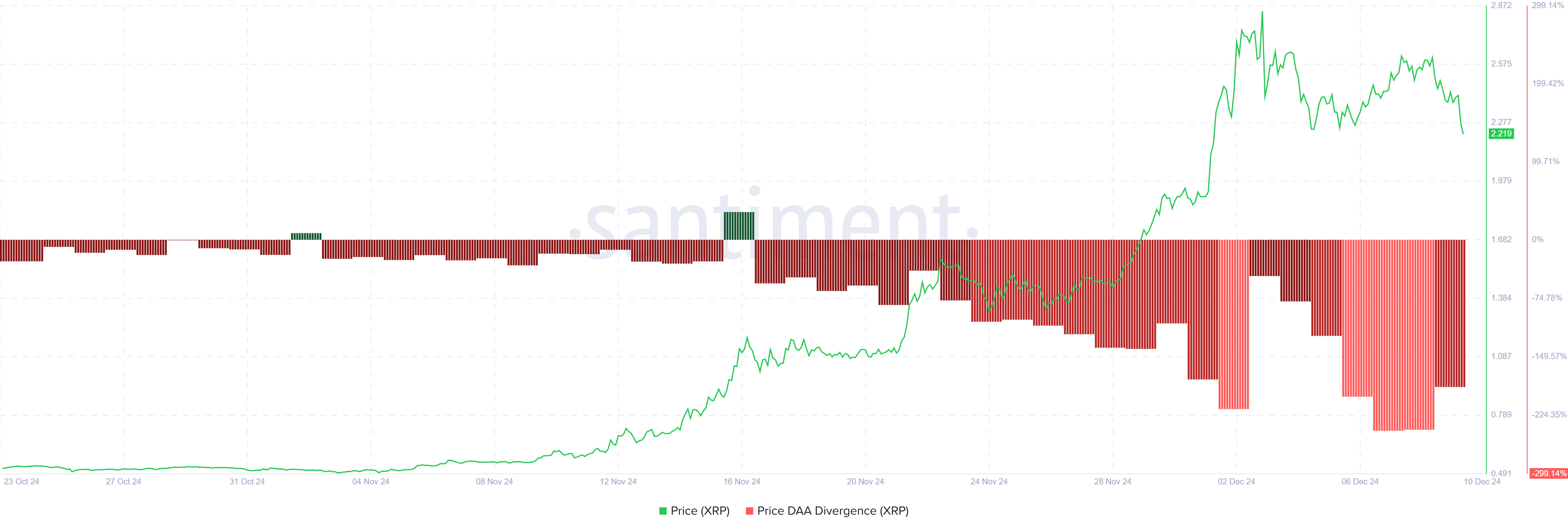 Ändå är utsikterna för XRP-priset inte särskilt positiva just nu. Price Daily Active Addresses (DAA) Divergence har visat en säljsignal de senaste dagarna. Det stigande priset och minskande deltagande (aktiva adresser) är ett negativt tecken för XRP.