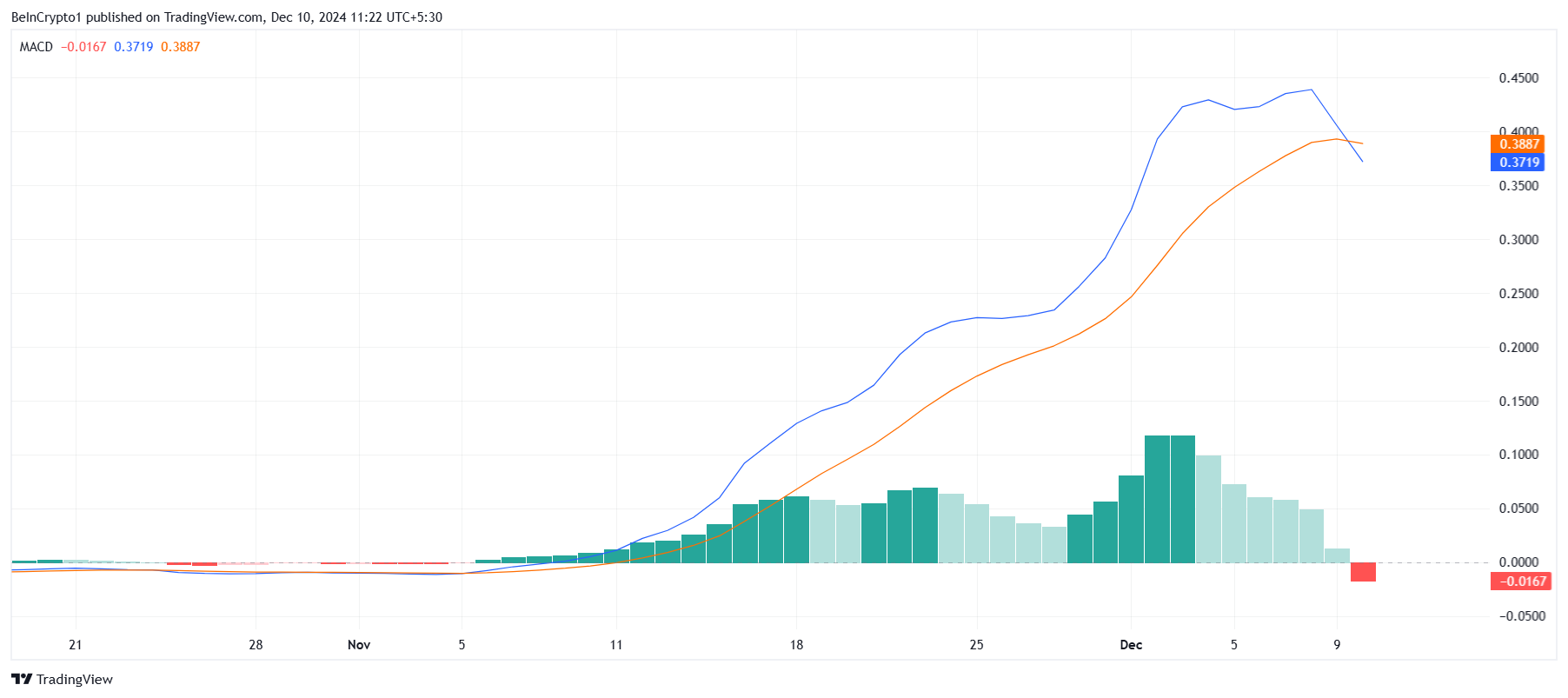 Ytterligare signalerar Moving Average Convergence Divergence (MACD)-indikatorn också en förändring i momentum. Efter mer än en månad av positivt momentum visar MACD nu tecken på negativt tryck.