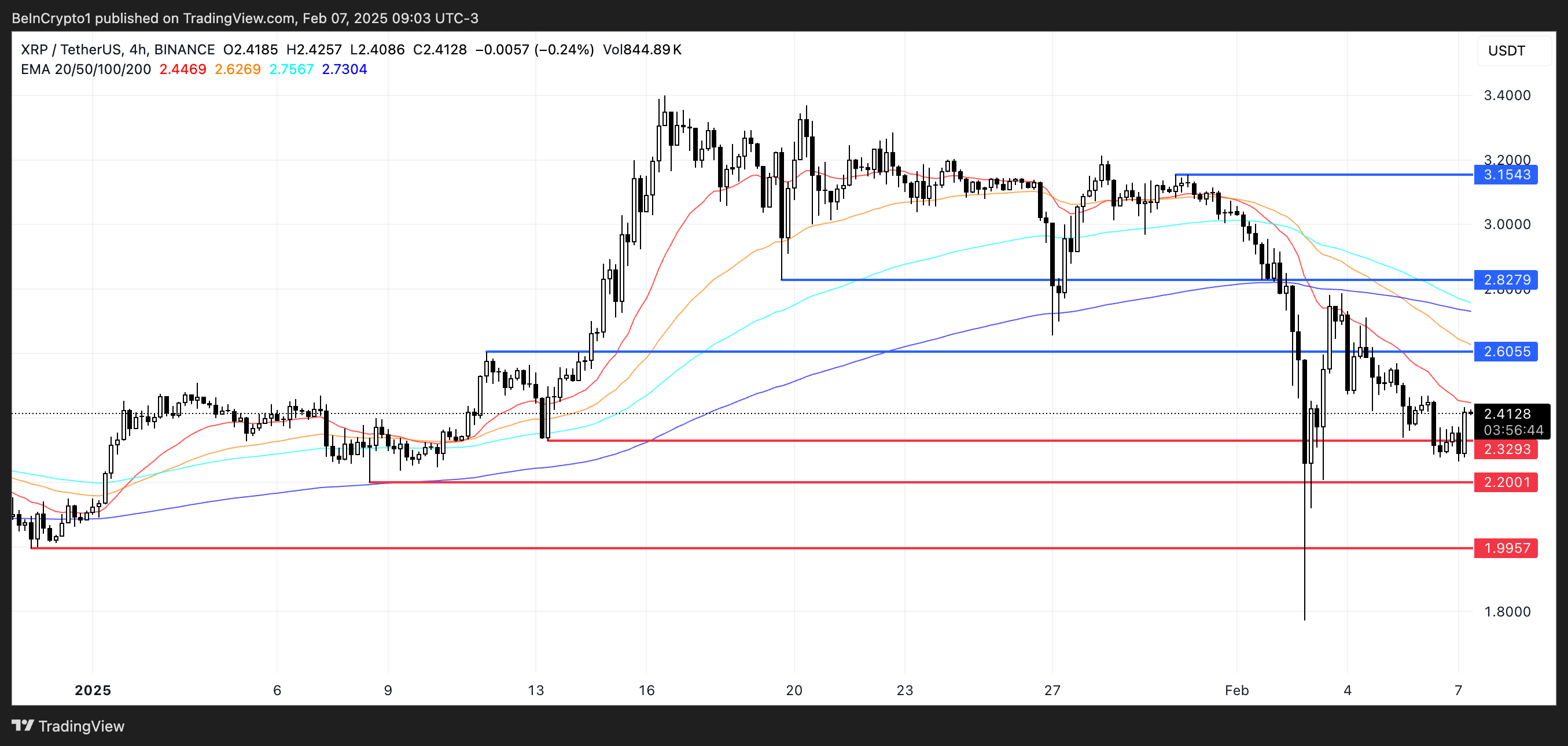 XRP:s Exponentiella Glidande Medelvärden (EMA) visar en björnaktig uppställning, då ett nytt dödskors bildades för två dagar sedan. Detta inträffar när kortsiktiga EMA korsar under långsiktiga EMA, vilket signalerar ihållande nedåtgående momentum.