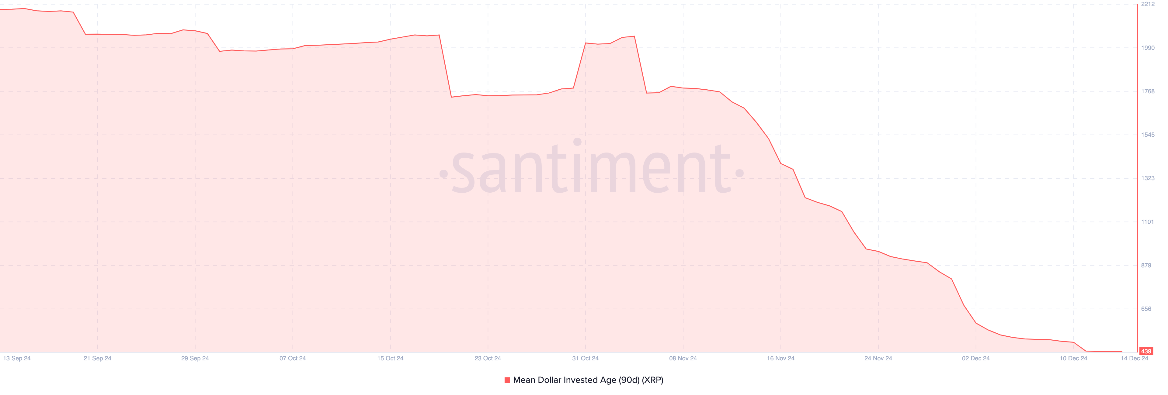 En stigande MDIA indikerar att mynt, vanligtvis hållna av nyckelaktörer, har förblivit stillastående. Historiskt sett har denna inaktivitet gjort det svårt för altcoinens pris att få fart. För närvarande har dock XRP:s MDIA sjunkit till en märkbart låg nivå. Denna metrik, som speglar medianåldern för transaktionerade tokens, signalerar återcirkulationen av tidigare vilande tillgångar.