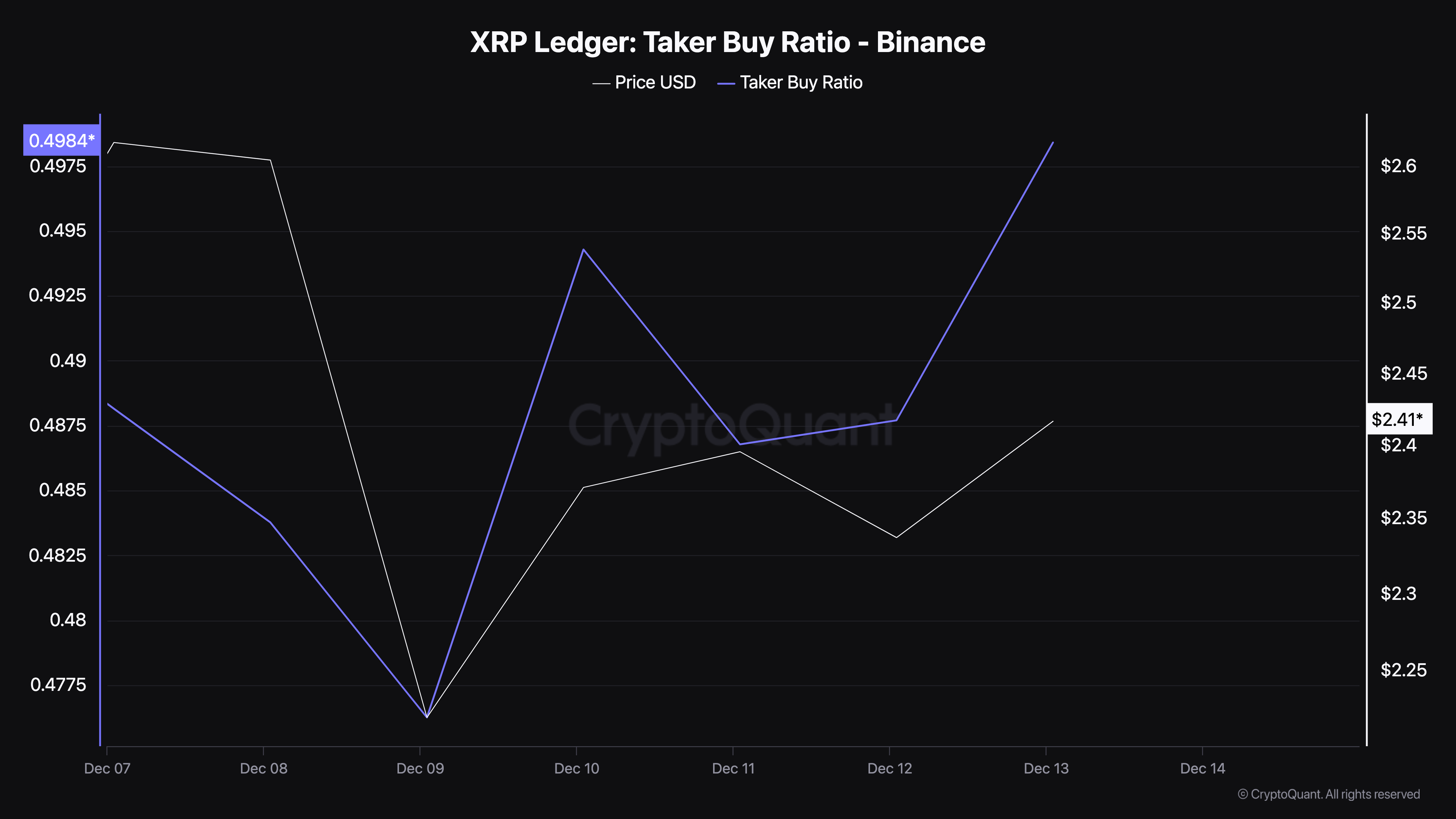 Förutom MDIA, antyder Taker Buy Ratio också potentialen för ytterligare XRP-prisökningar. Detta förhållande mäter andelen köporder som fylls jämfört med totala affärer på derivatmarknaden.
