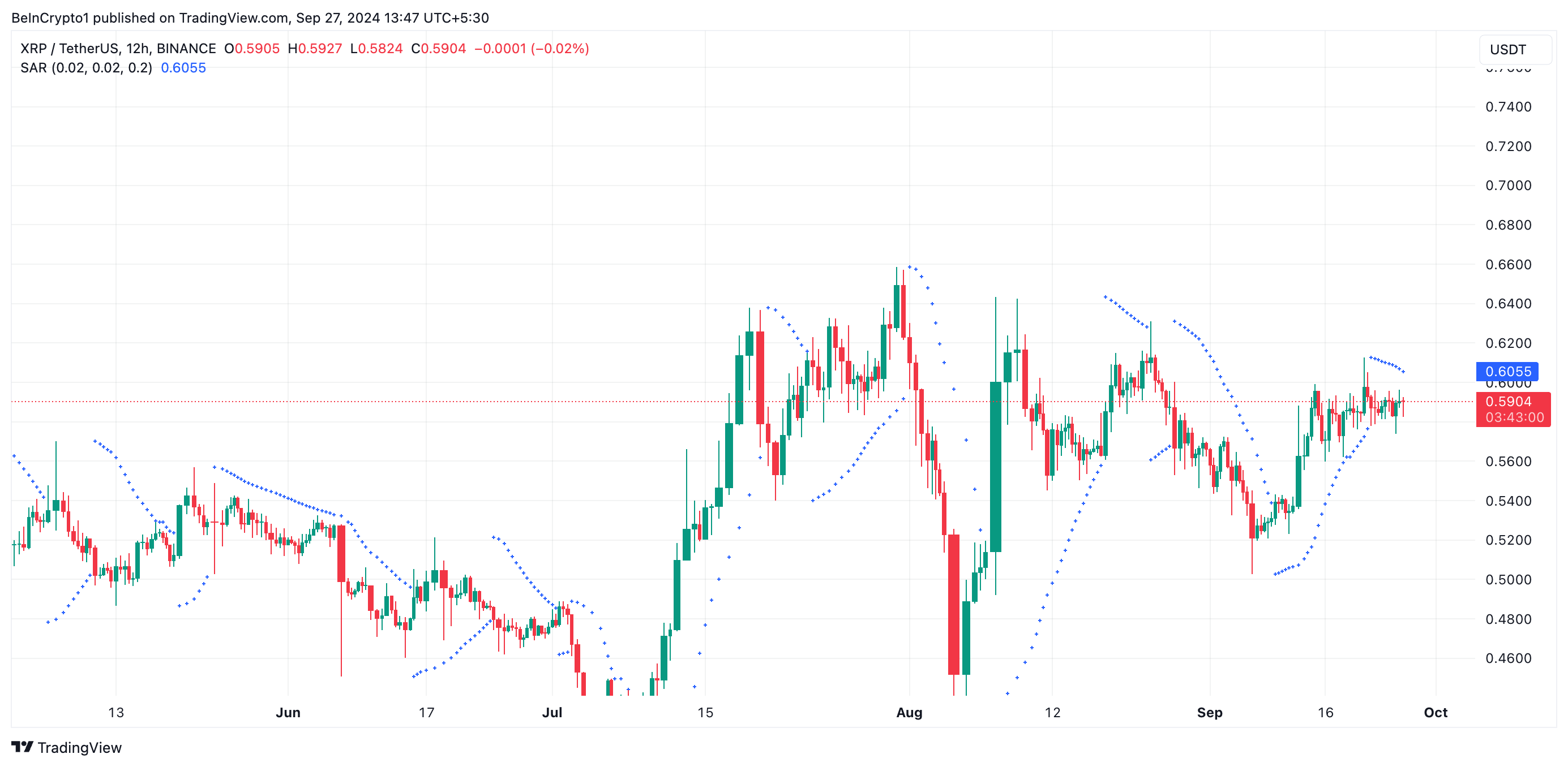 Dessutom ger inte avläsningarna från XRP:s Parabolic Stop and Reverse (SAR)-indikator mycket hopp. Vid publiceringstillfället ligger punkterna för denna indikator ovanför tokenens pris, vilket signalerar en nedåtgående rörelse på marknaden.