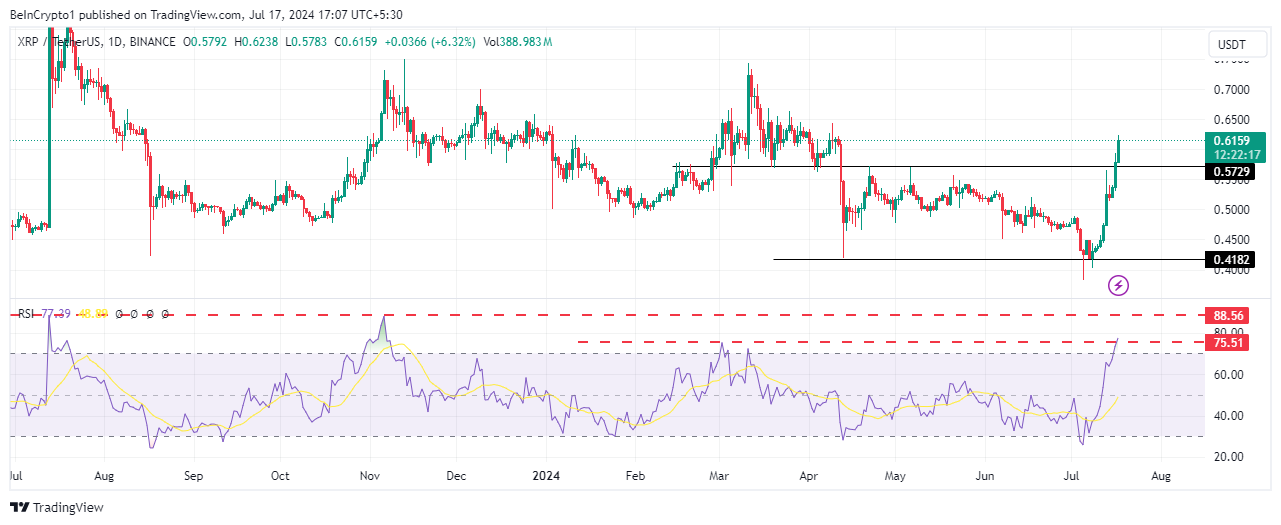 Samtidigt ligger fokus på Ripples inhemska token XRP, som har stigit till den högsta nivån på flera månader och handlas för $0,62 i skrivande stund. Relative Strength Index (RSI) på 75 visar att XRP-tokenen är massivt överköpt, även om den ännu inte är mogen för att säljas, eftersom den har gått så här högt tidigare.