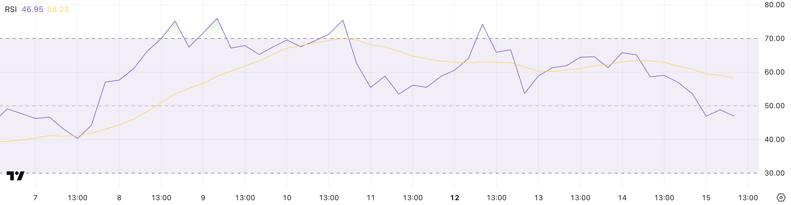 XRP:s Relative Strength Index (RSI) har sjunkit avsevärt, från 65,13 igår till 46,95 idag.