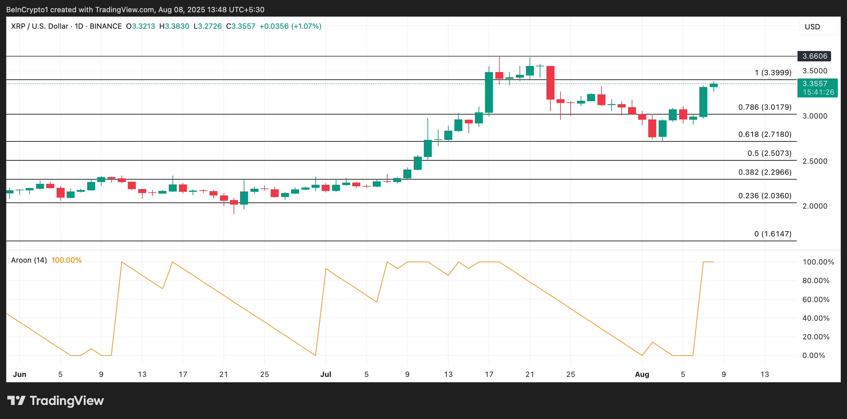 På det dagliga diagrammet stöder XRP:s Aroon Up Line denna positiva utsikt. Den är 100 % vid pressens tidpunkt, vilket indikerar att tokenens rally är starkt och stöds av betydande köpsida tryck.