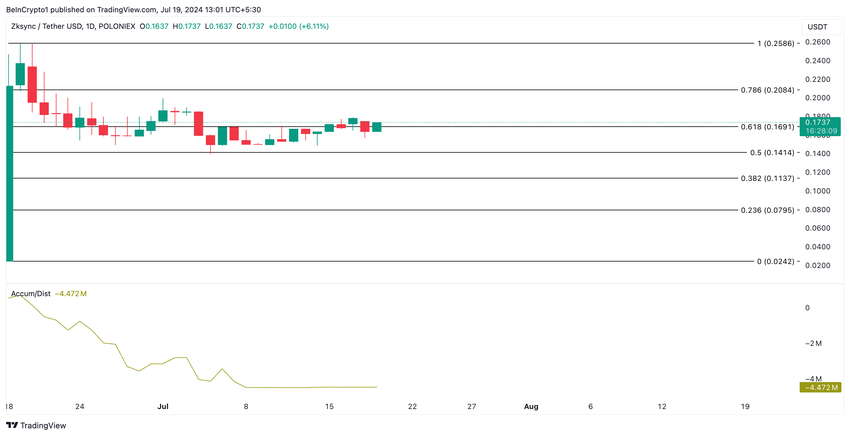 ZK:s fallande Ackumulations-/distributionslinje (A/D), som observerats på ett endagsdiagram, bekräftar nedgången i efterfrågan på altcoin. Med -4,47 miljoner vid presstillfället har den minskat med 30% sedan den 5 juli.